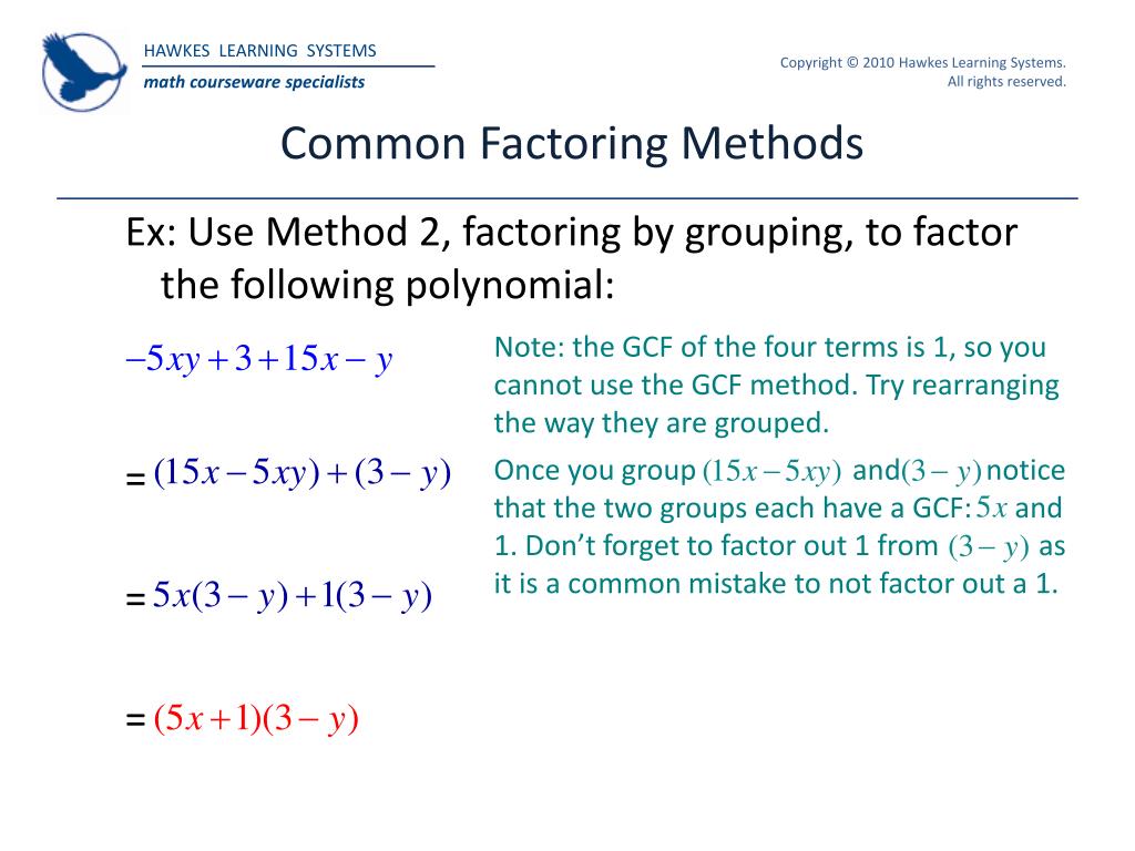 Example 9: Common Factoring Methods Use the Factor by Grouping method to factor the following polynomial. = = = We could also group the first and third terms and the second and fourth terms to obtain the same result. = = = OR
