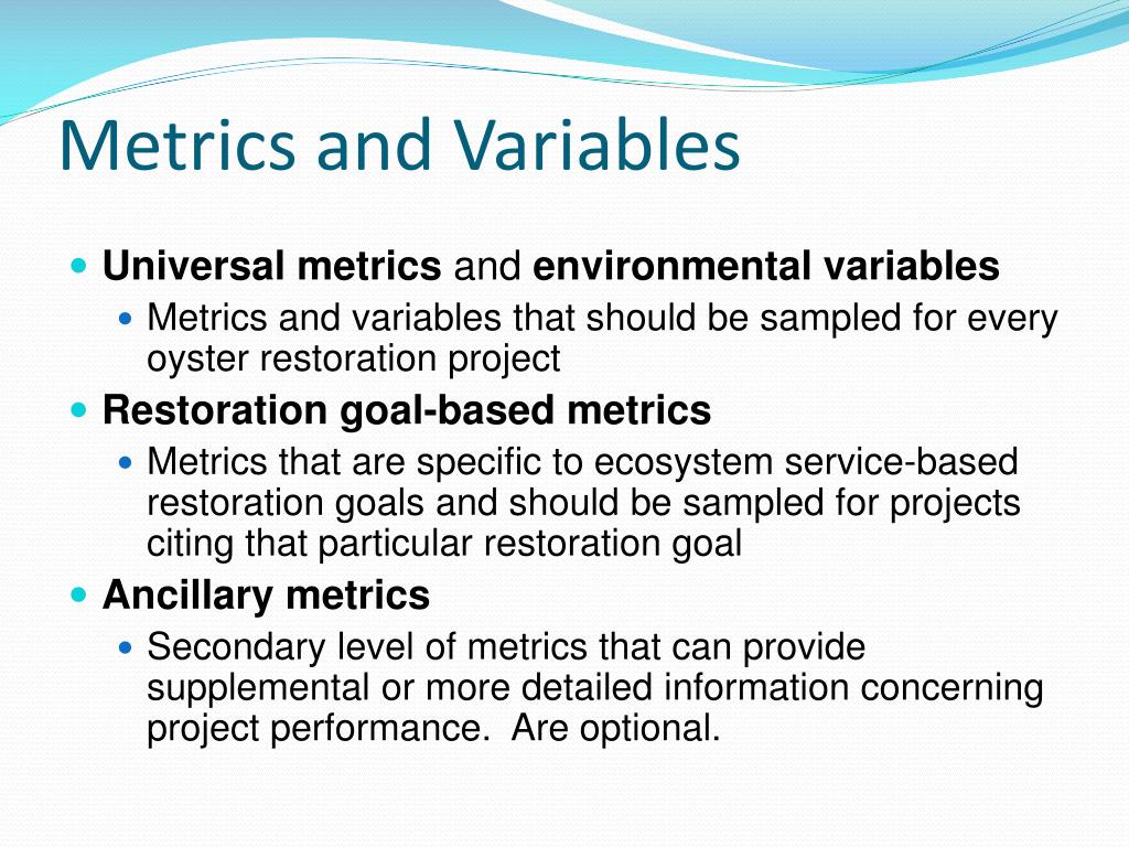 Metrics and Variables • Universal metrics and environmental variables • Metrics and variables that should be sampled for every oyster restoration project • Restoration goal-based metrics • Metrics that are specific to ecosystem service-based restoration goals and should be sampled for projects citing that particular restoration goal • Ancillary metrics • Secondary level of metrics that can provide supplemental or more detailed information concerning project performance. Are optional.
