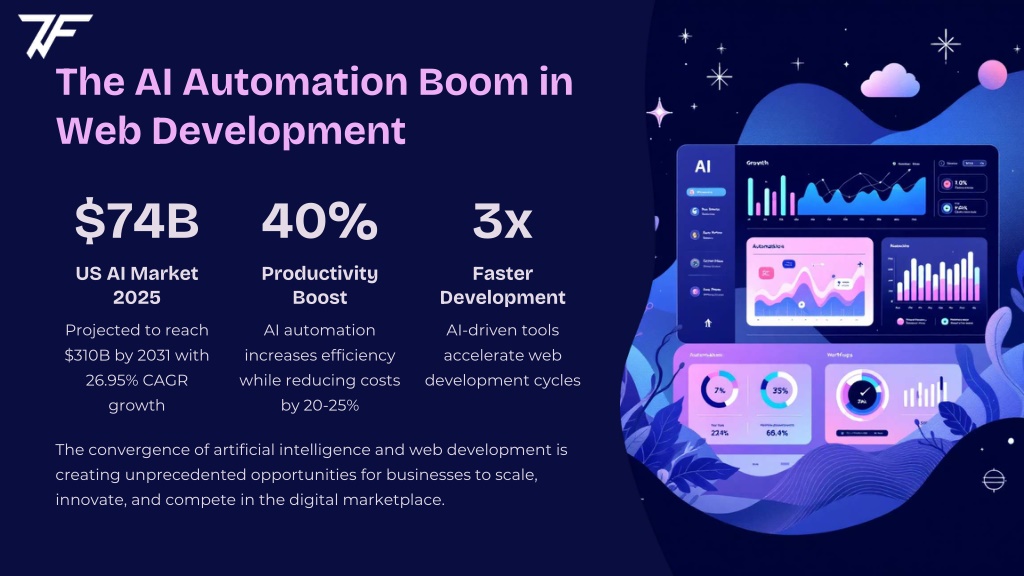 The AI Automation Boom in Web Development $74B US AI Market 2025 40% Productivity Boost 3x Faster Development Projected to reach $310B by 2031 with 26.95% CAGR growth AI automation increases efficiency while reducing costs by 20-25% AI-driven tools accelerate web development cycles The convergence of artificial intelligence and web development is creating unprecedented opportunities for businesses to scale, innovate, and compete in the digital marketplace.