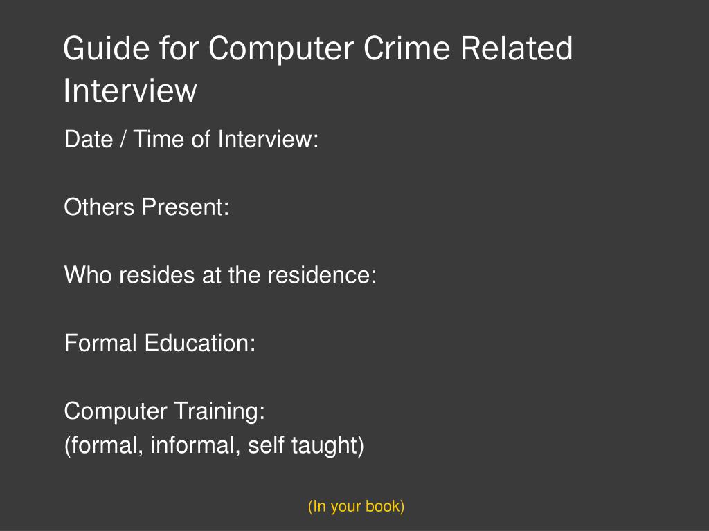 Guide for Computer Crime Related Interview Date / Time of Interview: Others Present: Who resides at the residence: Formal Education: Computer Training: (formal, informal, self taught) (In your book)