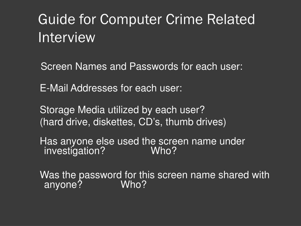 Guide for Computer Crime Related Interview Screen Names and Passwords for each user: E-Mail Addresses for each user: Storage Media utilized by each user? (hard drive, diskettes, CD’s, thumb drives) Has anyone else used the screen name under investigation? Who? Was the password for this screen name shared with anyone? Who?