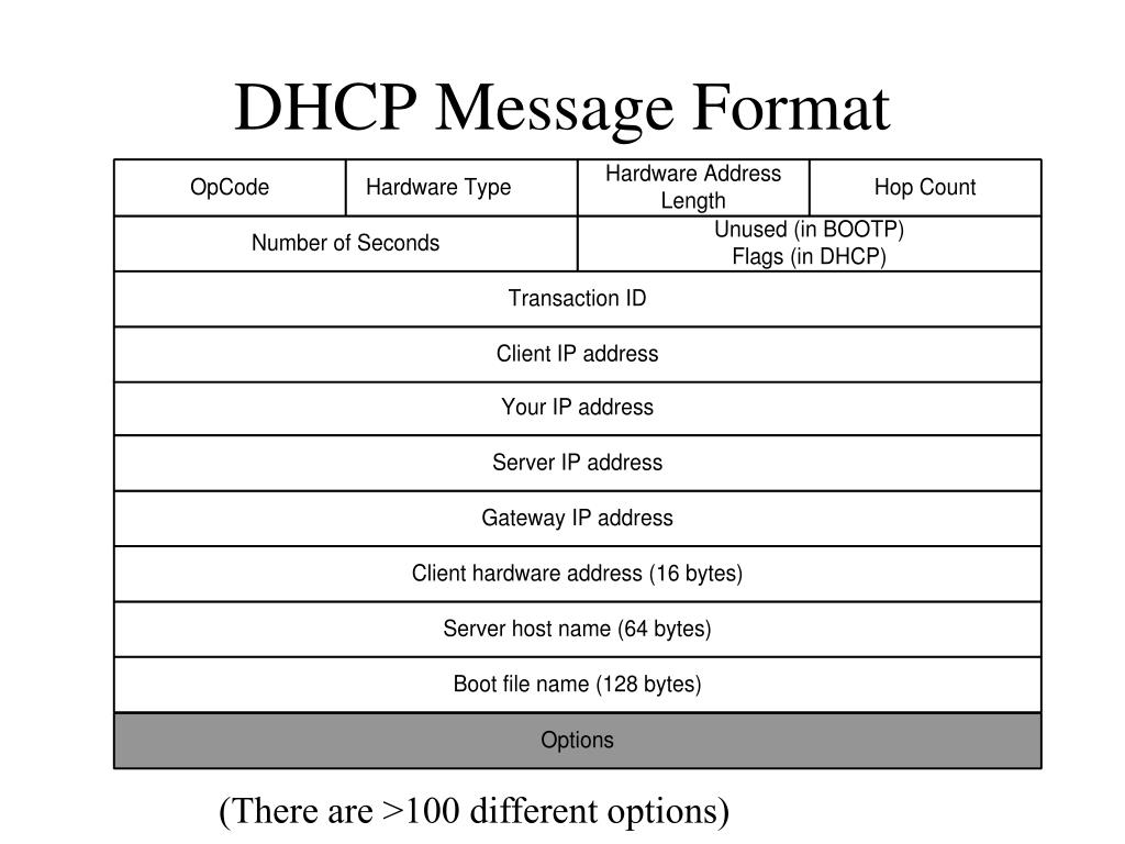 DHCP • OpCode: 1 (Request), 2(Reply) Note: DHCP message type is sent in an option • Hardware Type: 1 (for Ethernet) • Hardware address length: 6 (for Ethernet) • Hop count: set to 0 by client • Transaction ID: Integer (used to match reply to response) • Seconds:number of seconds since the client started to boot • Client IP address, Your IP address, server IP address, Gateway IP address, client hardware address, server host name, boot file name:client fills in the information that it has, leaves rest blank