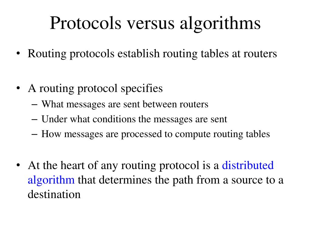 Protocols versus algorithms • Routing protocols establish routing tables at routers • A routing protocol specifies • What messages are sent between routers • Under what conditions the messages are sent • How messages are processed to compute routing tables • At the heart of any routing protocol is a distributed algorithm that determines the path from a source to a destination