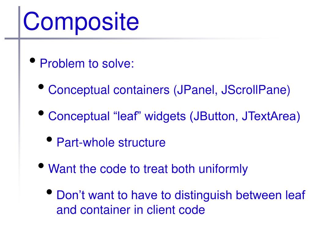 Composite • Problem to solve: • Conceptual containers (JPanel, JScrollPane) • Conceptual “leaf” widgets (JButton, JTextArea) • Part-whole structure • Want the code to treat both uniformly • Don’t want to have to distinguish between leaf and container in client code