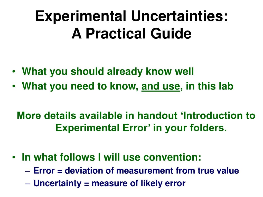 Experimental Uncertainties: A Practical Guide. What you should already know well What you need to know, and use , in this lab More details available in handout ‘Introduction to Experimental Error’ in your folders. In what follows I will use convention: