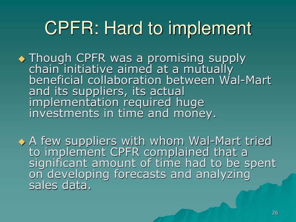 CPFR: Hard to implement • Though CPFR was a promising supply chain initiative aimed at a mutually beneficial collaboration between Wal-Mart and its suppliers, its actual implementation required huge investments in time and money. • A few suppliers with whom Wal-Mart tried to implement CPFR complained that a significant amount of time had to be spent on developing forecasts and analyzing sales data.
