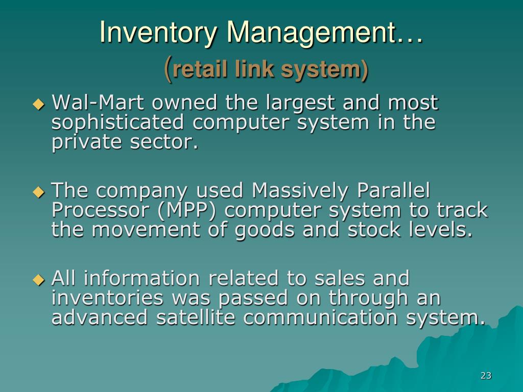 Inventory Management…(retail link system) • Wal-Mart owned the largest and most sophisticated computer system in the private sector. • The company used Massively Parallel Processor (MPP) computer system to track the movement of goods and stock levels. • All information related to sales and inventories was passed on through an advanced satellite communication system.