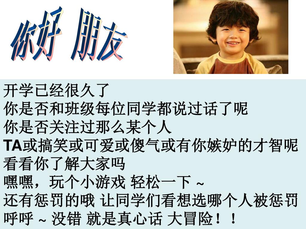 你好 朋友 开学已经很久了 你是否和班级每位同学都说过话了呢 你是否关注过那么某个人 TA或搞笑或可爱或傻气或有你嫉妒的才智呢 看看你了解大家吗 嘿嘿,玩个小游戏 轻松一下 ~ 还有惩罚的哦 让同学们看想选哪个人被惩罚 呼呼 ~ 没错 就是真心话 大冒险!!