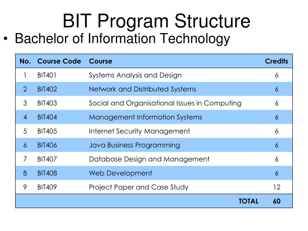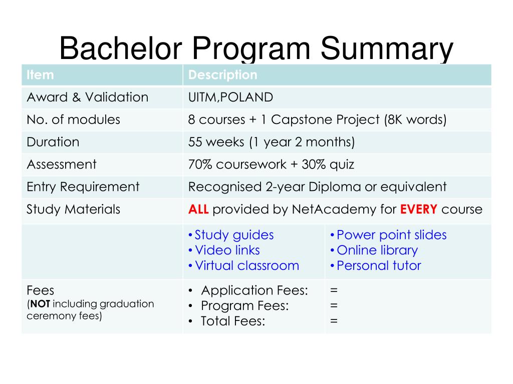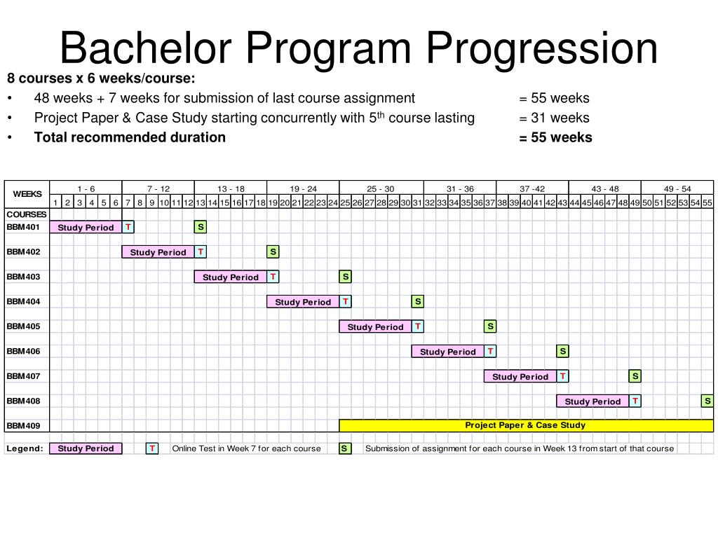 Bachelor Program Progression 8 courses x 6 weeks/course: • 48 weeks + 7 weeks for submission of last course assignment = 55 weeks • Project Paper & Case Study starting concurrently with 5th course lasting = 31 weeks • Total recommended duration = 55 weeks