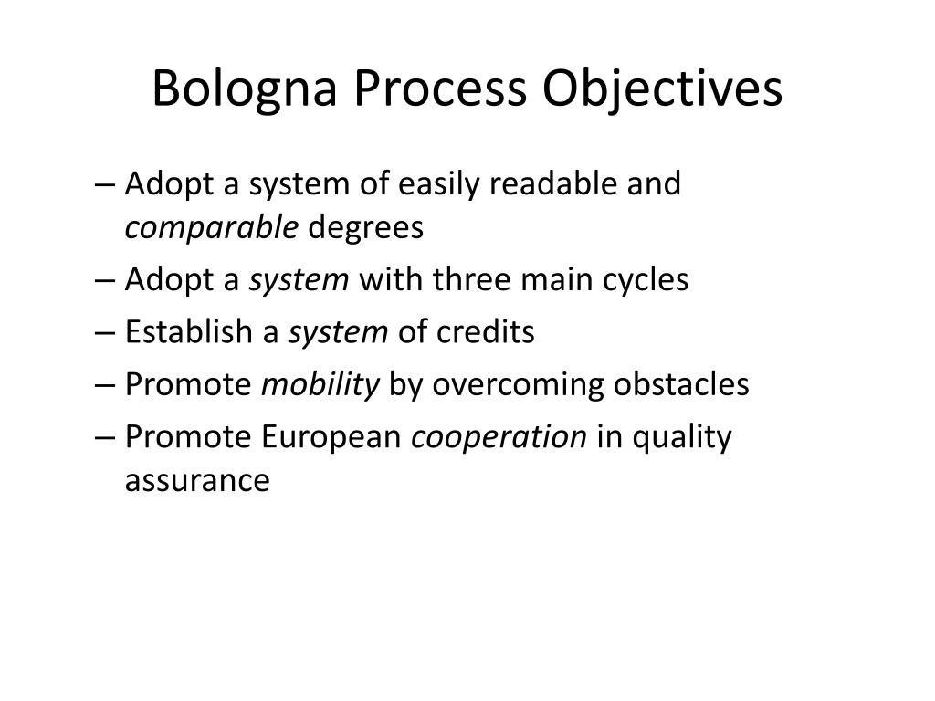 Bologna Process Objectives • Adopt a system of easily readable and comparable degrees • Adopt a system with three main cycles • Establish a system of credits • Promote mobility by overcoming obstacles • Promote European cooperation in quality assurance