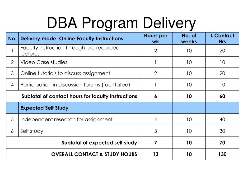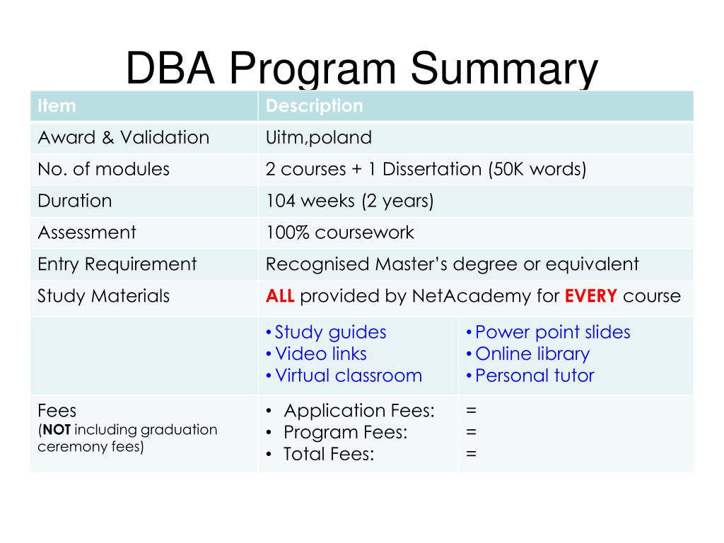 DBA Program Structure • Core Stage: two (2) courses • Dissertation & Defense stage: thesis of at least 50K words