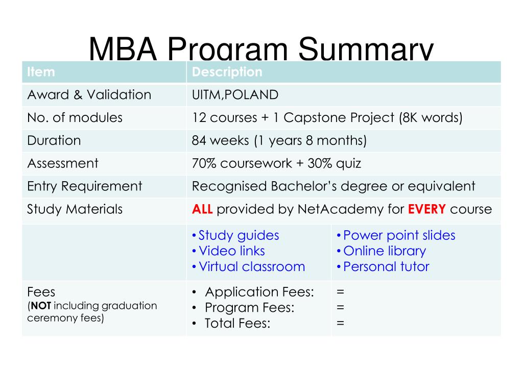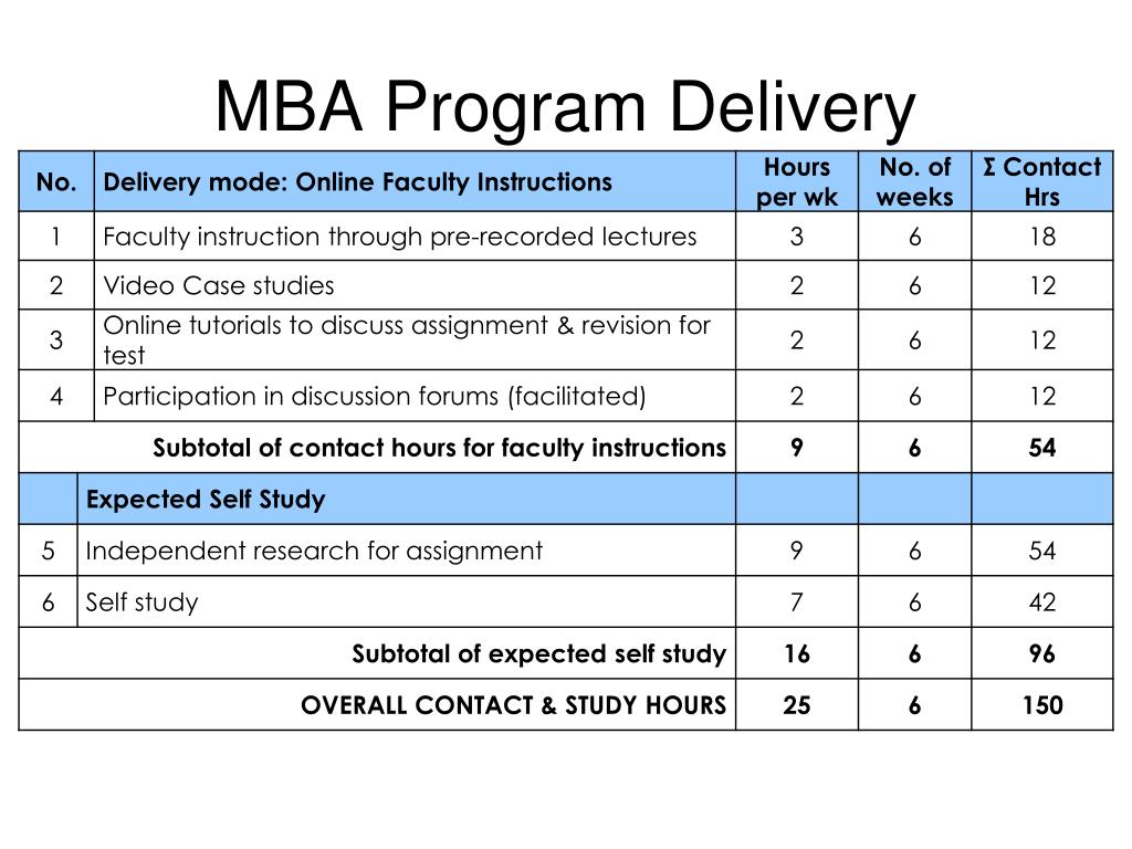 MBA Program Progression 12 courses x 6 weeks/course: • 72 weeks + 6 weeks for submission of last course assignment = 78 weeks • Capstone project starting concurrently with 11th course lasting = 24 weeks (6 months ) • Total recommended duration = 84 weeks