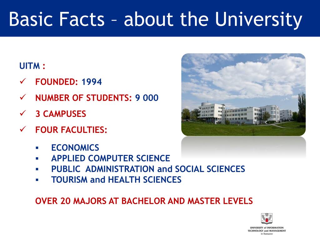 Basic Facts – about the University • UITM: • FOUNDED:1994 • NUMBER OF STUDENTS:9 000 • 3 CAMPUSES • FOUR FACULTIES: • ECONOMICS • APPLIED COMPUTER SCIENCE • PUBLIC ADMINISTRATION and SOCIAL SCIENCES • TOURISM and HEALTH SCIENCES • OVER 20 MAJORS AT BACHELOR AND MASTER LEVELS