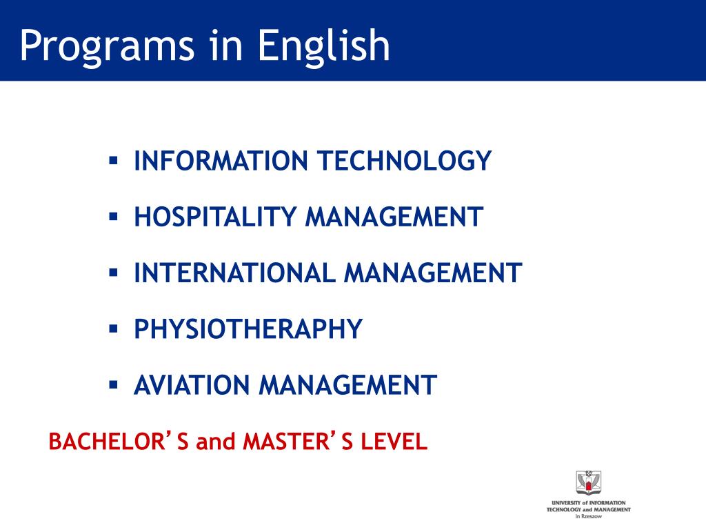 Programs in English • INFORMATION TECHNOLOGY • HOSPITALITY MANAGEMENT • INTERNATIONAL MANAGEMENT • PHYSIOTHERAPHY • AVIATION MANAGEMENT BACHELOR’S and MASTER’S LEVEL