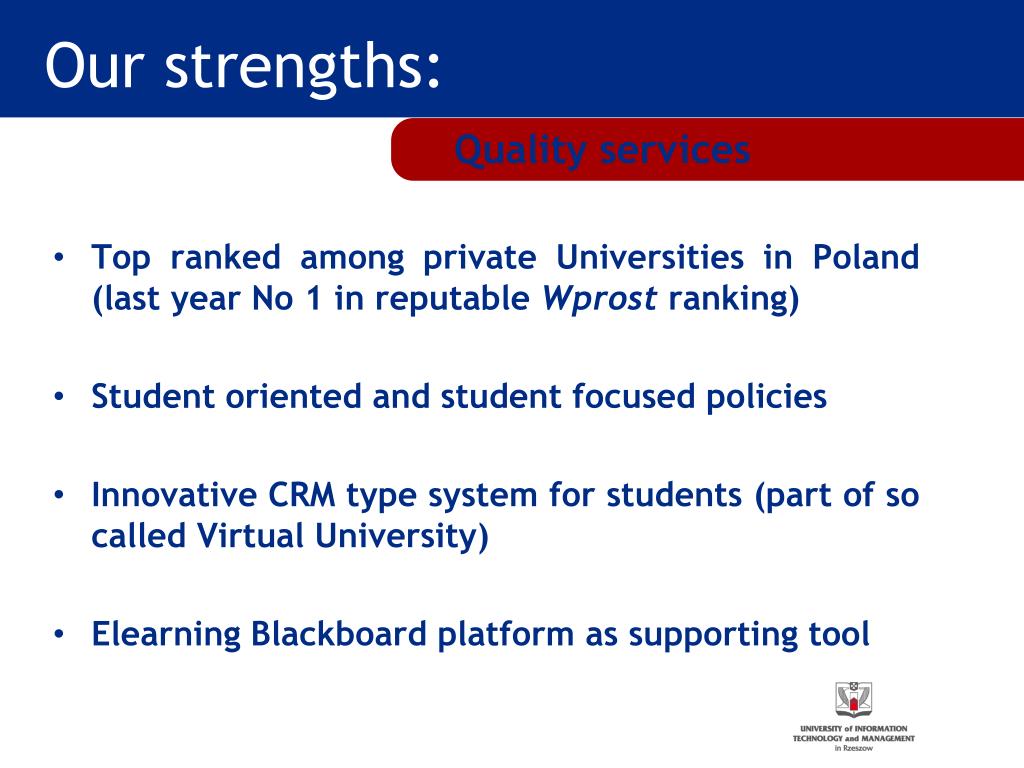 Our strengths: • Top ranked among private Universities in Poland (last year No 1 in reputable Wprostranking) • Student oriented and student focused policies • Innovative CRM type system for students (part of so called Virtual University) • Elearning Blackboard platform as supporting tool Qualityservices