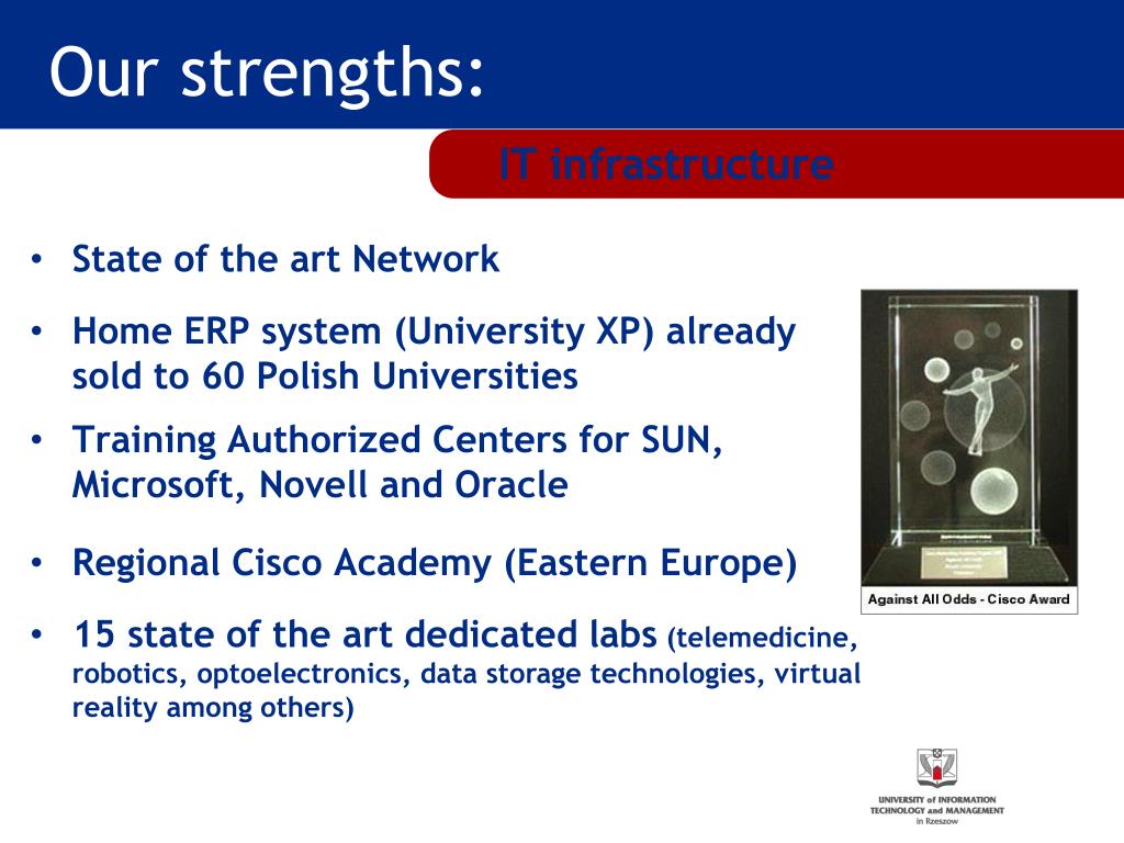 Our strengths: IT infrastructure • State of the art Network • Home ERP system (University XP) already sold to 60 Polish Universities • Training Authorized Centers for SUN, Microsoft, Novell and Oracle • Regional Cisco Academy (Eastern Europe) • 15 state of the art dedicated labs (telemedicine, robotics, optoelectronics, data storage technologies, virtual reality among others)