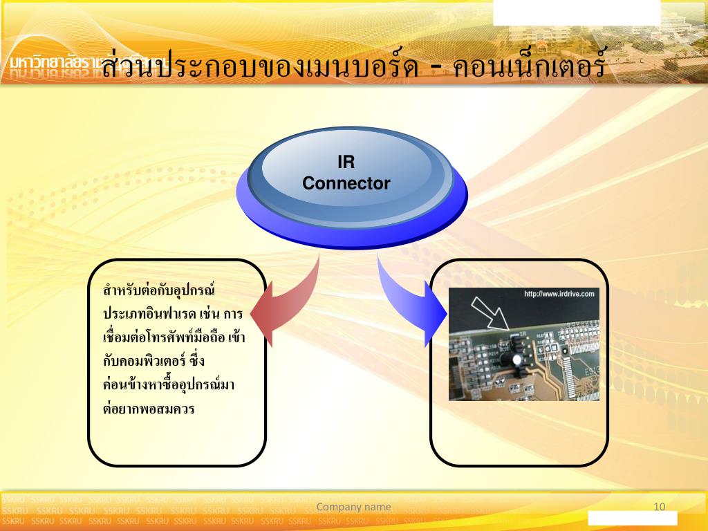 ส่วนประกอบของเมนบอร์ด - คอนเน็กเตอร์ IR Connector สำหรับต่อกับอุปกรณ์ประเภทอินฟาเรด เช่น การเชื่อมต่อโทรศัพท์มือถือ เข้ากับคอมพิวเตอร์ ซึ่งค่อนข้างหาซื้ออุปกรณ์มาต่อยากพอสมควร Company name