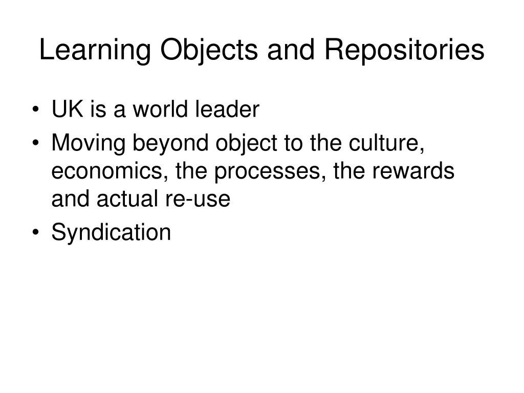 Learning Objects and Repositories • UK is a world leader • Moving beyond object to the culture, economics, the processes, the rewards and actual re-use • Syndication