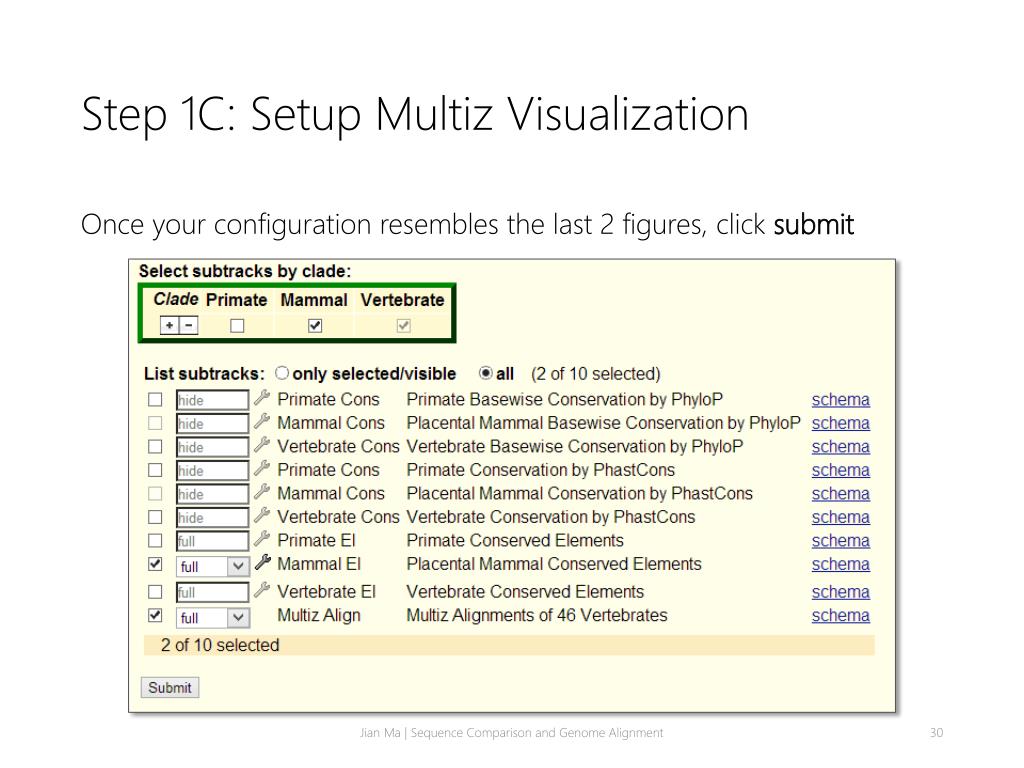 Step 1C: Setup Multiz Visualization Once your configuration resembles the last 2 figures, click submit Jian Ma | Sequence Comparison and Genome Alignment