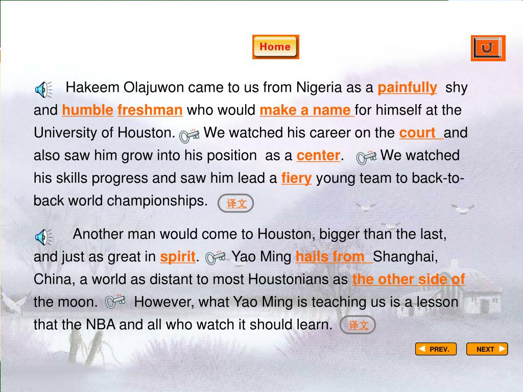 译文 译文 z.w 2 Hakeem Olajuwon came to us from Nigeria as a painfullyshy and humblefreshman who would make a name for himself at the University of Houston. We watched his career on the courtand also saw him grow into his position as a center. We watched his skills progress and saw him lead a fieryyoung team to back-to-back world championships. Another man would come to Houston, bigger than the last, and just as great in spirit. Yao Ming hails fromShanghai, China, a world as distant to most Houstonians as the other side ofthe moon. However, what Yao Ming is teaching us is a lesson that the NBA and all who watch it should learn.