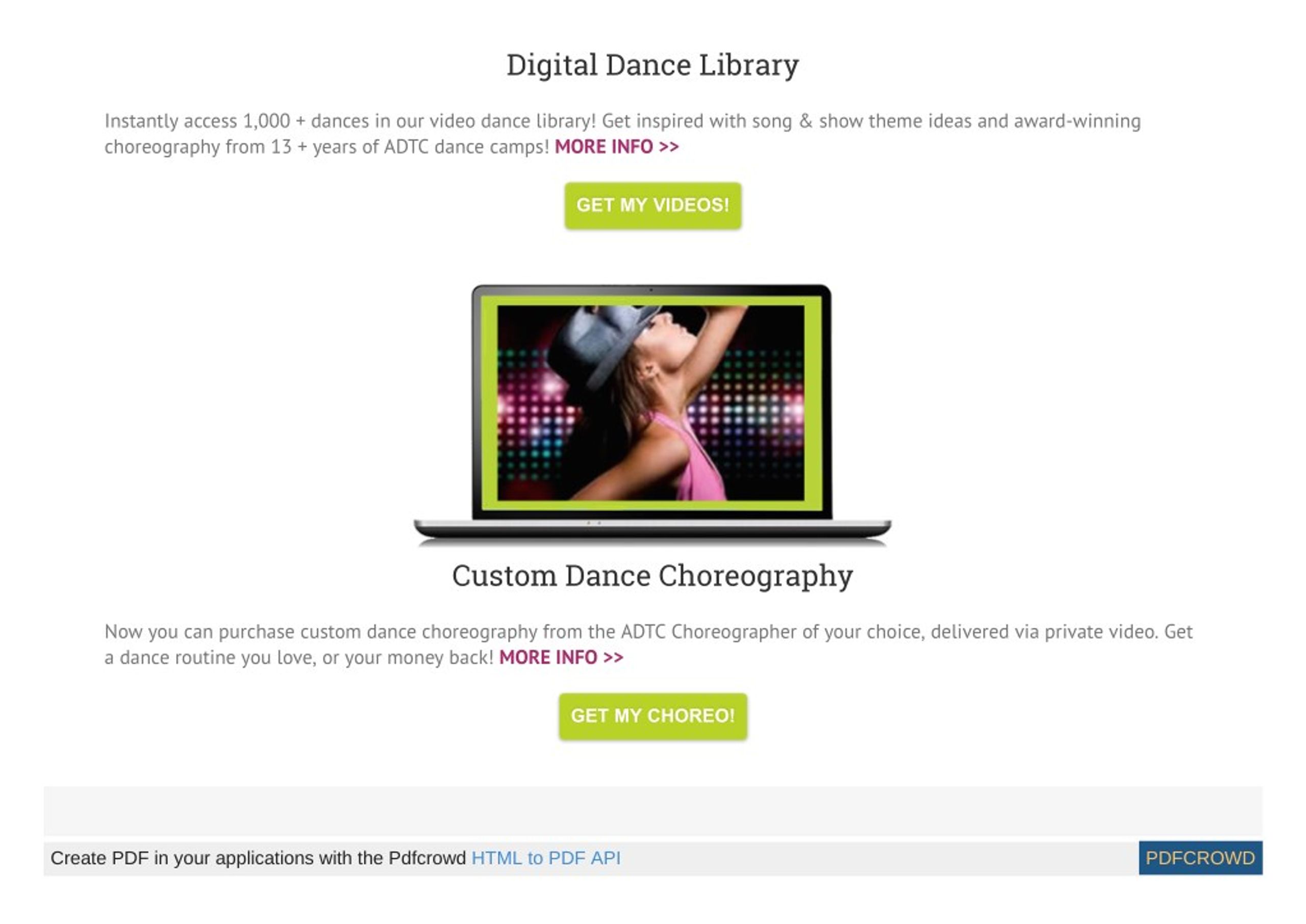Digital Dance Library Instantly access 1,000 + dances in our video dance library! Get inspired with song & show theme ideas and award-winning choreography from 13 + years of ADTC dance camps! MORE INFO >> GET MY VIDEOS! Custom Dance Choreography Now you can purchase custom dance choreography from the ADTC Choreographer of your choice, delivered via private video. Get a dance routine you love, or your money back! MORE INFO >> GET MY CHOREO! Create PDF in your applications with the Pdfcrowd HTML to PDF API PDFCROWD