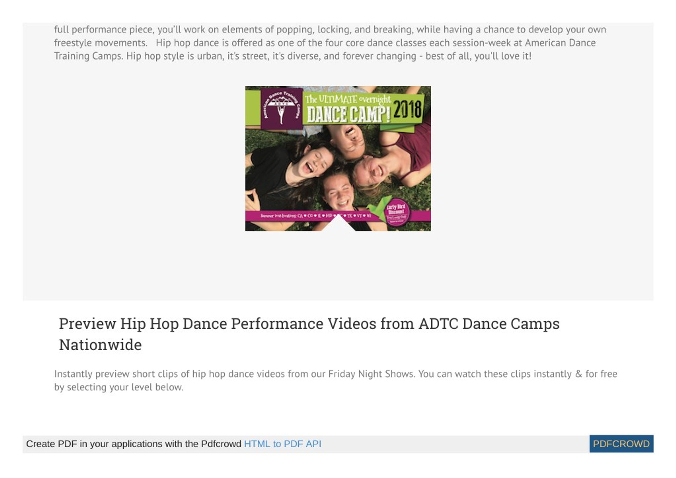 full performance piece, you’ll work on elements of popping, locking, and breaking, while having a chance to develop your own freestyle movements. Hip hop dance is offered as one of the four core dance classes each session-week at American Dance Training Camps. Hip hop style is urban, it's street, it's diverse, and forever changing - best of all, you'll love it! Preview Hip Hop Dance Performance Videos from ADTC Dance Camps Nationwide Instantly preview short clips of hip hop dance videos from our Friday Night Shows. You can watch these clips instantly & for free by selecting your level below. Create PDF in your applications with the Pdfcrowd HTML to PDF API PDFCROWD
