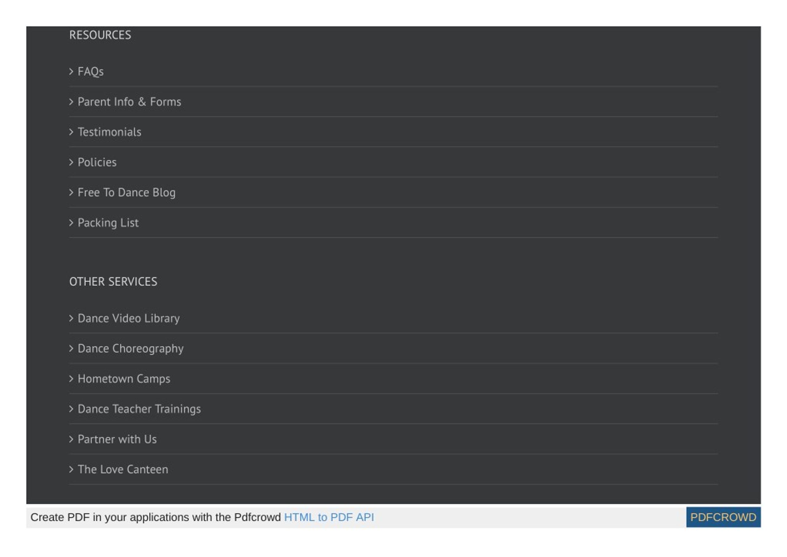 RESOURCES FAQs Parent Info & Forms Testimonials Policies Free To Dance Blog Packing List OTHER SERVICES Dance Video Library Dance Choreography Hometown Camps Dance Teacher Trainings Partner with Us The Love Canteen Create PDF in your applications with the Pdfcrowd HTML to PDF API PDFCROWD