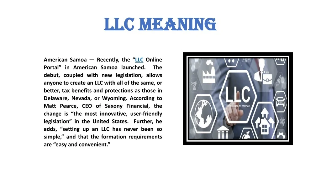 LLC Meaning American Samoa — Recently, the “LLC Online Portal” in American Samoa launched. The debut, coupled with new legislation, allows anyone to create an LLC with all of the same, or better, tax benefits and protections as those in Delaware, Nevada, or Wyoming. According to Matt Pearce, CEO of Saxony Financial, the change is “the most innovative, user-friendly legislation” in the United States. Further, he adds, “setting up an LLC has never been so simple,” and that the formation requirements are “easy and convenient.”