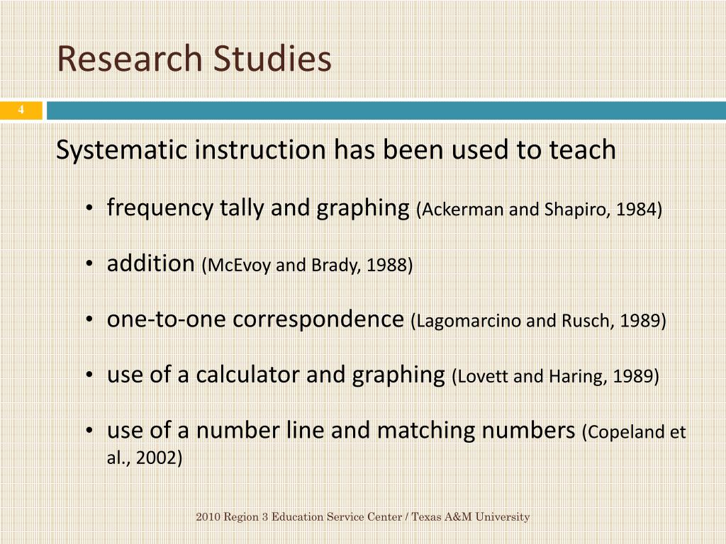 Research Studies Systematic instruction has been used to teach • frequency tally and graphing (Ackerman and Shapiro, 1984) • addition (McEvoy and Brady, 1988) • one-to-one correspondence (Lagomarcino and Rusch, 1989) • use of a calculator and graphing (Lovett and Haring, 1989) • use of a number line and matching numbers (Copeland et al., 2002) 2010 Region 3 Education Service Center / Texas A&M University