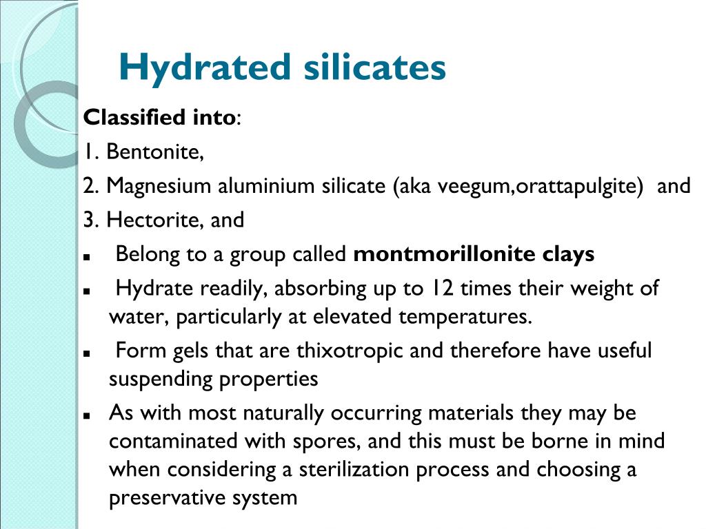 Hydrated silicates Classified into: 1. Bentonite, 2. Magnesium aluminium silicate (aka veegum,orattapulgite) and 3. Hectorite, and Belong to a group called montmorillonite clays Hydrate readily, absorbing up to 12 times their weight of water, particularly at elevated temperatures. Form gels that are thixotropic and therefore have useful suspending properties As with most naturally occurring materials they may be contaminated with spores, and this must be borne in mind when considering a sterilization process and choosing a preservative system