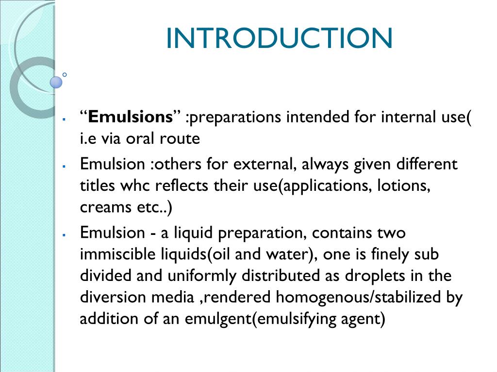 “Emulsions” :preparations intended for internal use( i.e via oral route Emulsion :others for external, always given different titles whc reflects their use(applications, lotions, creams etc..) Emulsion - a liquid preparation, contains two immiscible liquids(oil and water), one is finely sub divided and uniformly distributed as droplets in the diversion media ,rendered homogenous/stabilized by addition of an emulgent(emulsifying agent) INTRODUCTION