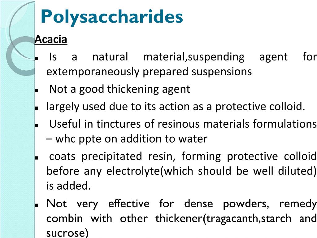 Polysaccharides Acacia Is a natural material,suspending agent for extemporaneously prepared suspensions Not a good thickening agent largely used due to its action as a protective colloid. Useful in tinctures of resinous materials formulations – whc ppte on addition to water coats precipitated resin, forming protective colloid before any electrolyte(which should be well diluted) is added. Not very effective for dense powders, remedy combin with other thickener(tragacanth,starch and sucrose)