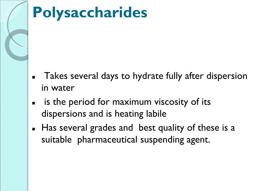 Polysaccharides Takes several days to hydrate fully after dispersion in water is the period for maximum viscosity of its dispersions and is heating labile Has several grades and best quality of these is a suitable pharmaceutical suspending agent.