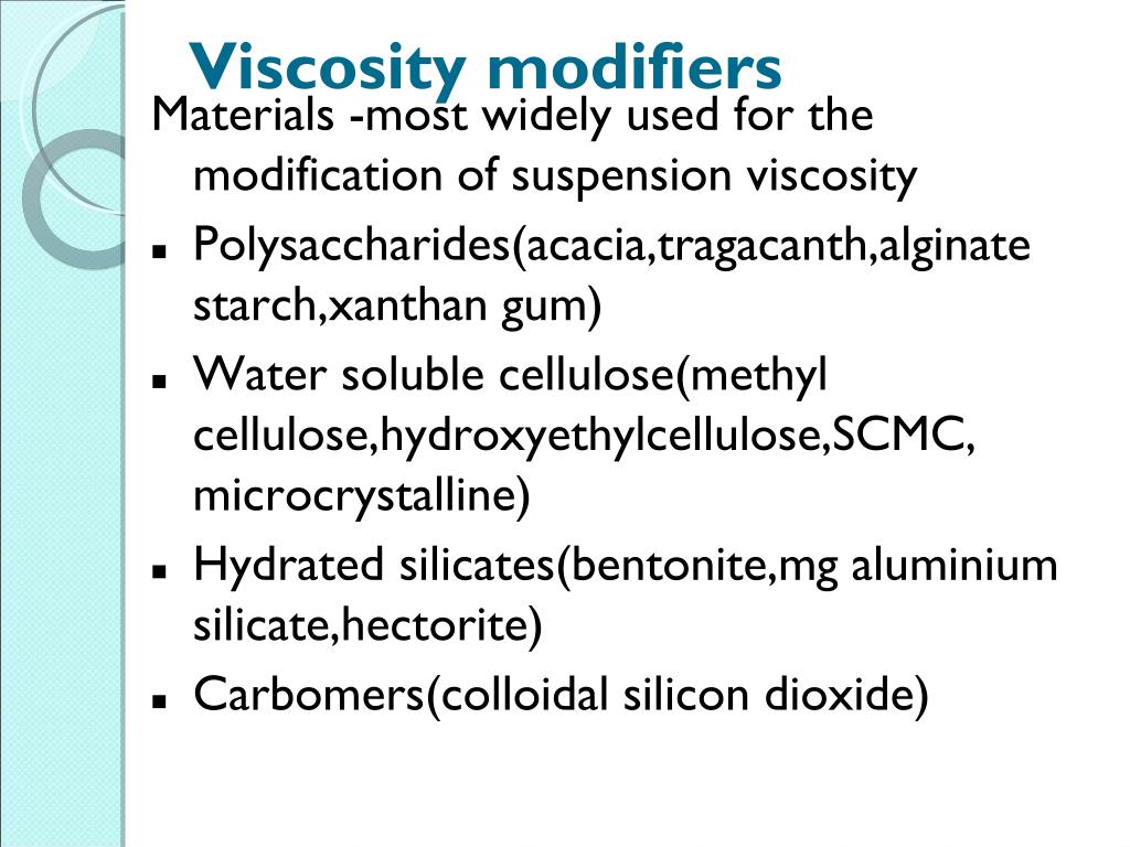 Viscosity modifiers Materials -most widely used for the modification of suspension viscosity Polysaccharides(acacia,tragacanth,alginate starch,xanthan gum) Water soluble cellulose(methyl cellulose,hydroxyethylcellulose,SCMC, microcrystalline) Hydrated silicates(bentonite,mg aluminium silicate,hectorite) Carbomers(colloidal silicon dioxide)