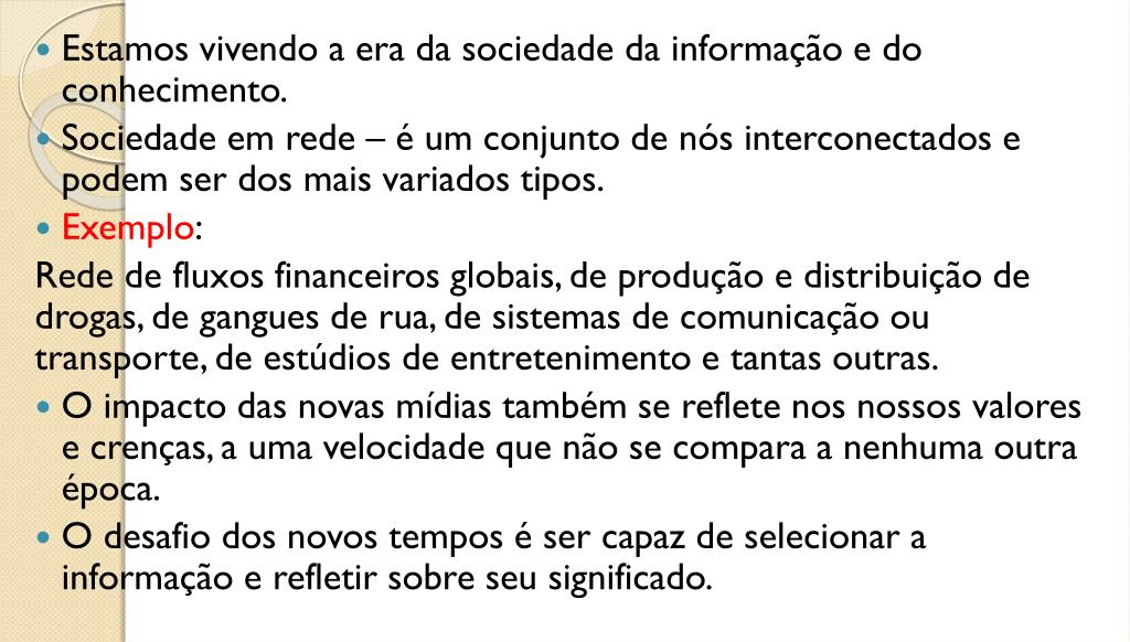 Estamos vivendo a era da sociedade da informação e do conhecimento. • Sociedade em rede – é um conjunto de nós interconectados e podem ser dos mais variados tipos. • Exemplo: Rede de fluxos financeiros globais, de produção e distribuição de drogas, de gangues de rua, de sistemas de comunicação ou transporte, de estúdios de entretenimento e tantas outras. • O impacto das novas mídias também se reflete nos nossos valores e crenças, a uma velocidade que não se compara a nenhuma outra época. • O desafio dos novos tempos é ser capaz de selecionar a informação e refletir sobre seu significado.