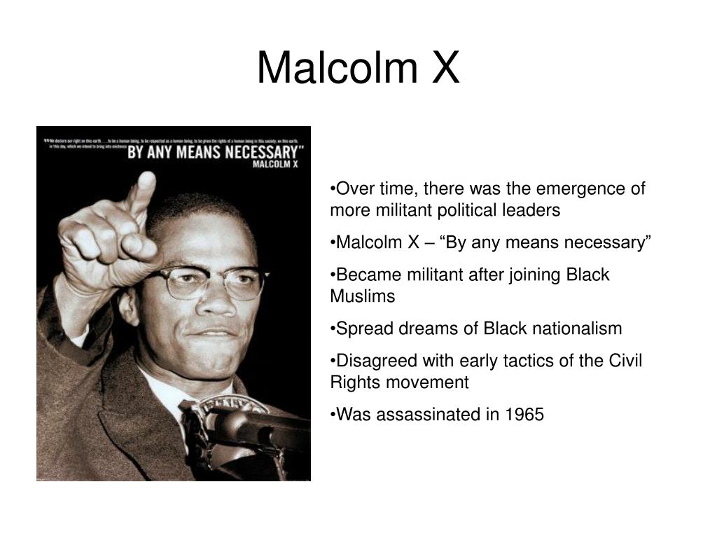 Malcolm X • Over time, there was the emergence of more militant political leaders • Malcolm X – “By any means necessary” • Became militant after joining Black Muslims • Spread dreams of Black nationalism • Disagreed with early tactics of the Civil Rights movement • Was assassinated in 1965