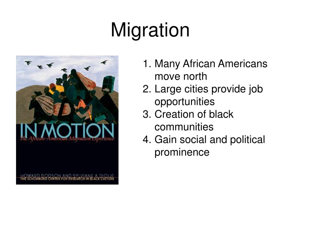 Migration • Many African Americans move north • Large cities provide job opportunities • Creation of black communities • Gain social and political prominence