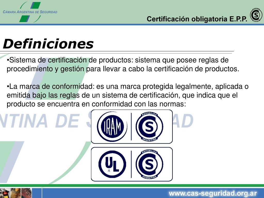 Requisitos • Los requisitos de seguridad se considerarán plenamente asegurados si se satisfacen las exigencias de seguridad establecidas en las normas elaboradas por el Instituto Argentino de Normalización IRAM, regionales MERCOSUR (NM) y Europeas (EN) o internacionales ISO. • Estos elementos de protección personal deberán contar con una certificación por Marca de Conformidad; extendida por un Organismo de Certificación reconocido por la SICyM y acreditado en el OAA.