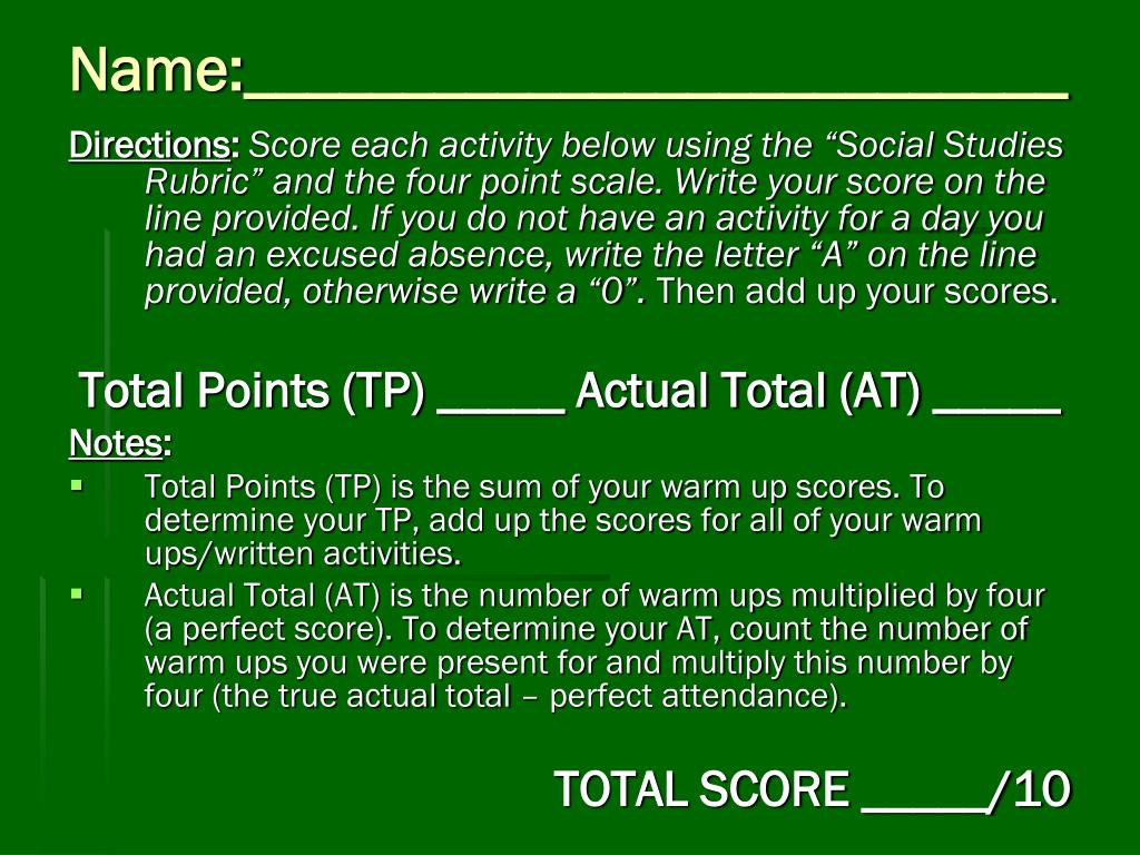 Name:__________________________ Directions:Score each activity below using the “Social Studies Rubric” and the four point scale. Write your score on the line provided. If you do not have an activity for a day you had an excused absence, write the letter “A” on the line provided, otherwise write a “0”. Then add up your scores. Total Points (TP) _____ Actual Total (AT) _____ Notes: • Total Points (TP) is the sum of your warm up scores. To determine your TP, add up the scores for all of your warm ups/written activities. • Actual Total (AT) is the number of warm ups multiplied by four (a perfect score). To determine your AT, count the number of warm ups you were present for and multiply this number by four (the true actual total – perfect attendance). TOTAL SCORE _____/10