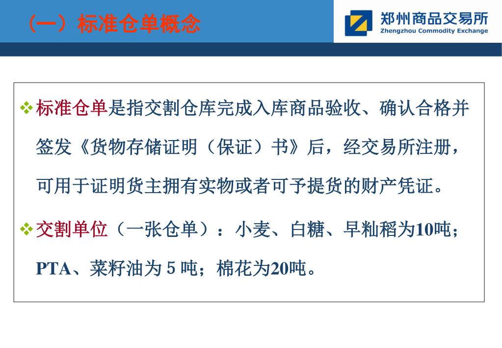 标准仓单是指交割仓库完成入库商品验收、确认合格并签发《货物存储证明(保证)书》后,经交易所注册,可用于证明货主拥有实物或者可予提货的财产凭证。标准仓单是指交割仓库完成入库商品验收、确认合格并签发《货物存储证明(保证)书》后,经交易所注册,可用于证明货主拥有实物或者可予提货的财产凭证。 交割单位(一张仓单):小麦、白糖、早籼稻为10吨;PTA、菜籽油为5吨;棉花为20吨。 (一)标准仓单概念