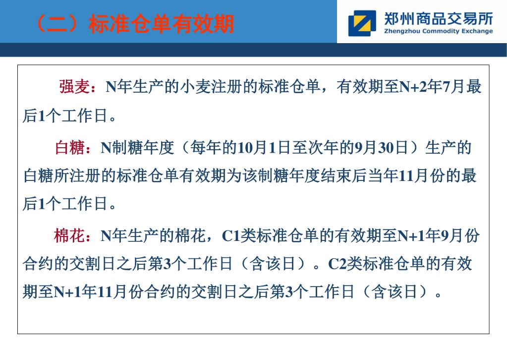 强麦:N年生产的小麦注册的标准仓单,有效期至N+2年7月最后1个工作日。 白糖:N制糖年度(每年的10月1日至次年的9月30日)生产的白糖所注册的标准仓单有效期为该制糖年度结束后当年11月份的最后1个工作日。 棉花:N年生产的棉花,C1类标准仓单的有效期至N+1年9月份合约的交割日之后第3个工作日(含该日)。C2类标准仓单的有效期至N+1年11月份合约的交割日之后第3个工作日(含该日)。 (二)标准仓单有效期
