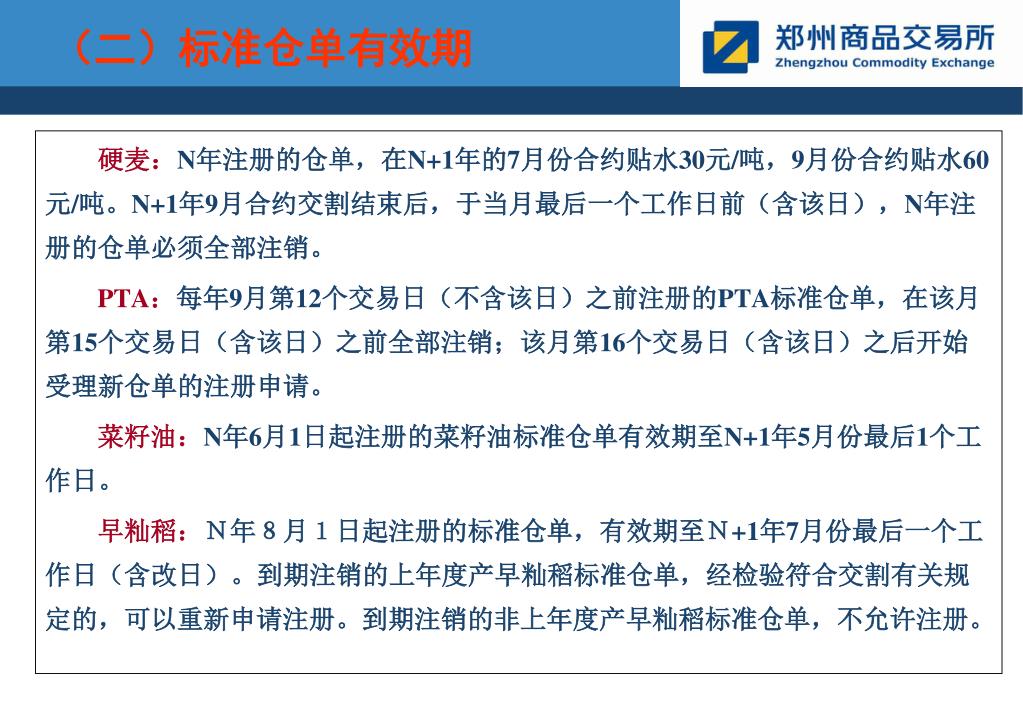 硬麦:N年注册的仓单,在N+1年的7月份合约贴水30元/吨,9月份合约贴水60元/吨。N+1年9月合约交割结束后,于当月最后一个工作日前(含该日),N年注册的仓单必须全部注销。 硬麦:N年注册的仓单,在N+1年的7月份合约贴水30元/吨,9月份合约贴水60元/吨。N+1年9月合约交割结束后,于当月最后一个工作日前(含该日),N年注册的仓单必须全部注销。 PTA:每年9月第12个交易日(不含该日)之前注册的PTA标准仓单,在该月第15个交易日(含该日)之前全部注销;该月第16个交易日(含该日)之后开始受理新仓单的注册申请。 菜籽油:N年6月1日起注册的菜籽油标准仓单有效期至N+1年5月份最后1个工作日。 早籼稻:N年8月1日起注册的标准仓单,有效期至N+1年7月份最后一个工作日(含改日)。到期注销的上年度产早籼稻标准仓单,经检验符合交割有关规定的,可以重新申请注册。到期注销的非上年度产早籼稻标准仓单,不允许注册。 (二)标准仓单有效期