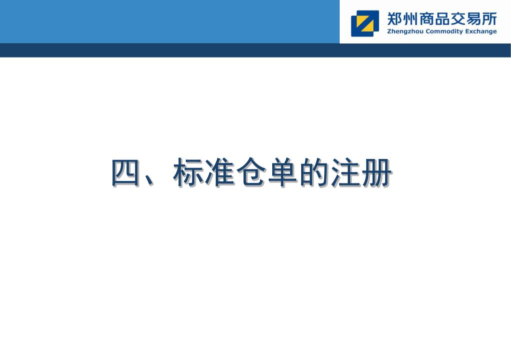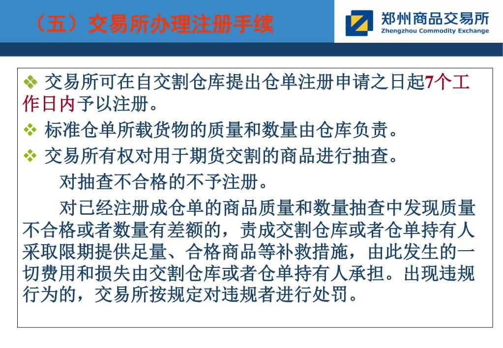交易所可在自交割仓库提出仓单注册申请之日起7个工作日内予以注册。交易所可在自交割仓库提出仓单注册申请之日起7个工作日内予以注册。 标准仓单所载货物的质量和数量由仓库负责。 交易所有权对用于期货交割的商品进行抽查。 对抽查不合格的不予注册。 对已经注册成仓单的商品质量和数量抽查中发现质量不合格或者数量有差额的,责成交割仓库或者仓单持有人采取限期提供足量、合格商品等补救措施,由此发生的一切费用和损失由交割仓库或者仓单持有人承担。出现违规行为的,交易所按规定对违规者进行处罚。 (五)交易所办理注册手续