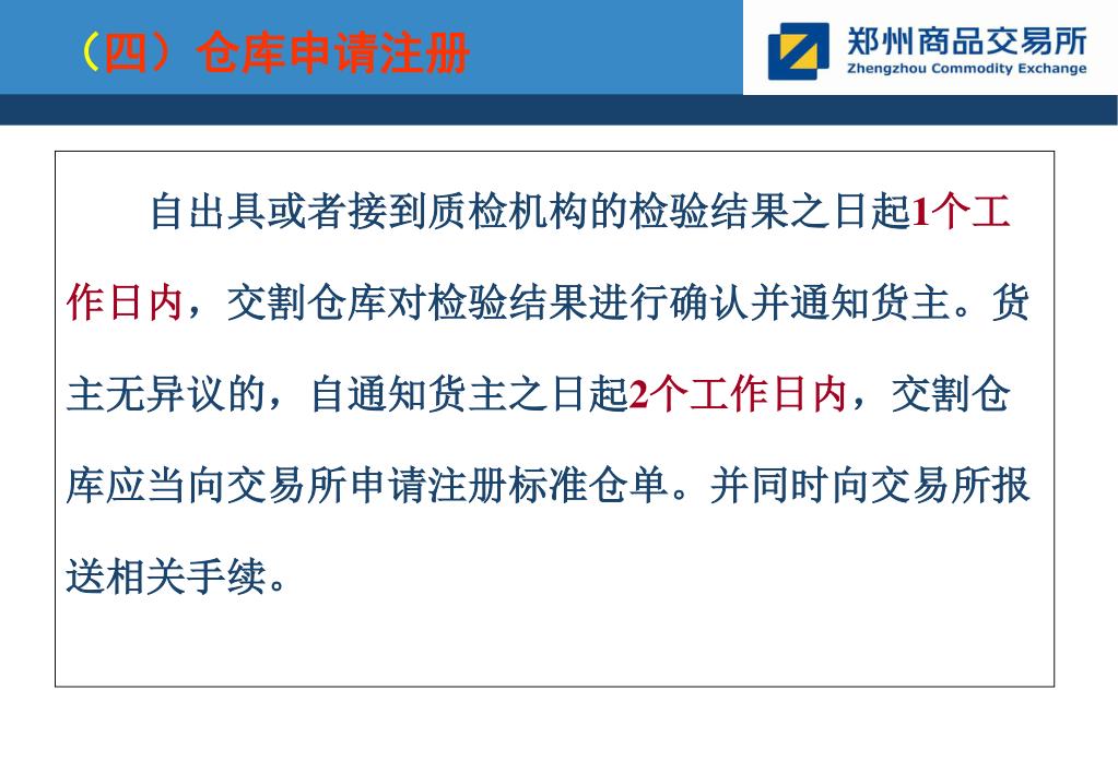 自出具或者接到质检机构的检验结果之日起1个工作日内,交割仓库对检验结果进行确认并通知货主。货主无异议的,自通知货主之日起2个工作日内,交割仓库应当向交易所申请注册标准仓单。并同时向交易所报送相关手续。 自出具或者接到质检机构的检验结果之日起1个工作日内,交割仓库对检验结果进行确认并通知货主。货主无异议的,自通知货主之日起2个工作日内,交割仓库应当向交易所申请注册标准仓单。并同时向交易所报送相关手续。 (四)仓库申请注册
