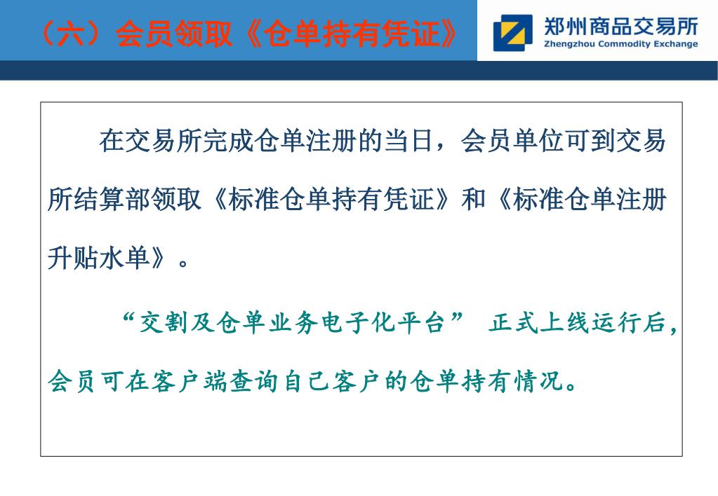 在交易所完成仓单注册的当日,会员单位可到交易所结算部领取《标准仓单持有凭证》和《标准仓单注册升贴水单》。 “交割及仓单业务电子化平台” 正式上线运行后,会员可在客户端查询自己客户的仓单持有情况。 (六)会员领取《仓单持有凭证》