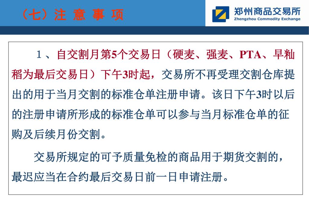 1、自交割月第5个交易日(硬麦、强麦、PTA、早籼稻为最后交易日)下午3时起,交易所不再受理交割仓库提出的用于当月交割的标准仓单注册申请。该日下午3时以后的注册申请所形成的标准仓单可以参与当月标准仓单的征购及后续月份交割。 1、自交割月第5个交易日(硬麦、强麦、PTA、早籼稻为最后交易日)下午3时起,交易所不再受理交割仓库提出的用于当月交割的标准仓单注册申请。该日下午3时以后的注册申请所形成的标准仓单可以参与当月标准仓单的征购及后续月份交割。 交易所规定的可予质量免检的商品用于期货交割的,最迟应当在合约最后交易日前一日申请注册。 (七)注 意 事 项