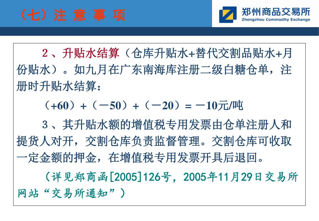 2、升贴水结算(仓库升贴水+替代交割品贴水+月份贴水)。如九月在广东南海库注册二级白糖仓单,注册时升贴水结算:2、升贴水结算(仓库升贴水+替代交割品贴水+月份贴水)。如九月在广东南海库注册二级白糖仓单,注册时升贴水结算: (+60)+(-50)+(-20)= -10元/吨 3、其升贴水额的增值税专用发票由仓单注册人和提货人对开,交割仓库负责监督管理。交割仓库可收取一定金额的押金,在增值税专用发票开具后退回。 (详见郑商函[2005]126号,2005年11月29日交易所网站“交易所通知”) (七)注 意 事 项