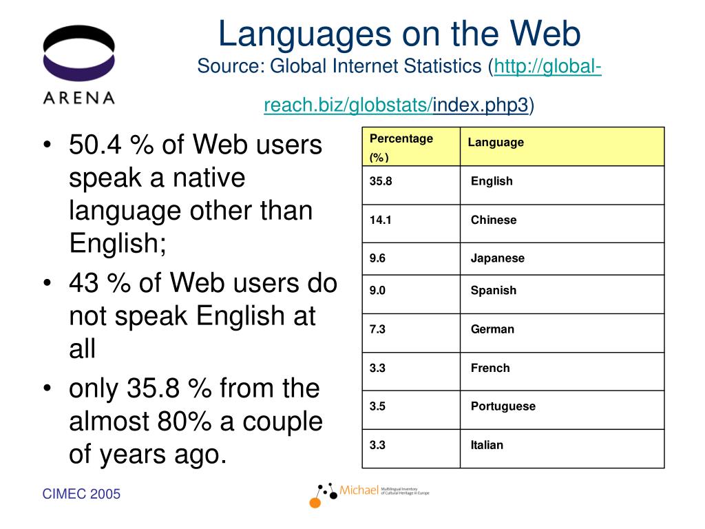 Languages on the WebSource: Global Internet Statistics (http://global-reach.biz/globstats/index.php3) • 50.4 % of Web users speak a native language other than English; • 43 % of Web users do not speak English at all • only 35.8 % from the almost 80% a couple of years ago.