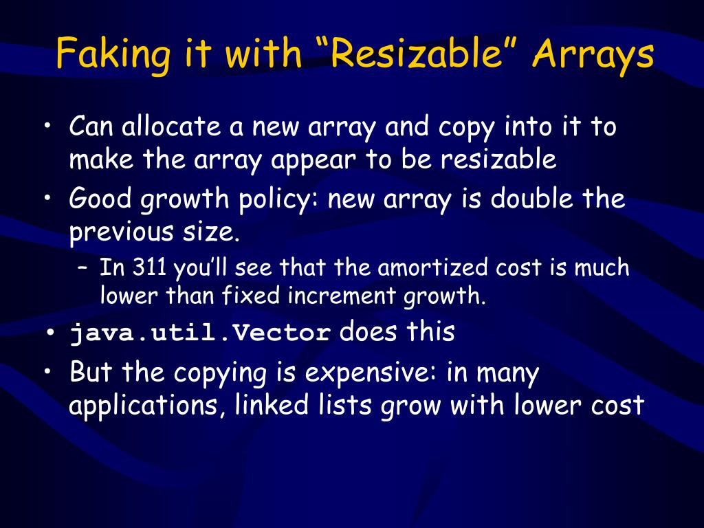 Faking it with “Resizable” Arrays • Can allocate a new array and copy into it to make the array appear to be resizable • Good growth policy: new array is double the previous size. • In 311 you’ll see that the amortized cost is much lower than fixed increment growth. • java.util.Vector does this • But the copying is expensive: in many applications, linked lists grow with lower cost