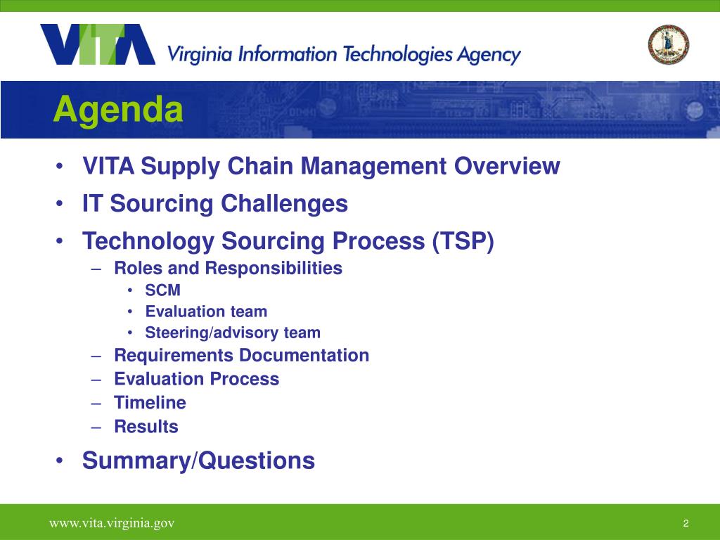 Agenda • VITA Supply Chain Management Overview • IT Sourcing Challenges • Technology Sourcing Process (TSP) • Roles and Responsibilities • SCM • Evaluation team • Steering/advisory team • Requirements Documentation • Evaluation Process • Timeline • Results • Summary/Questions